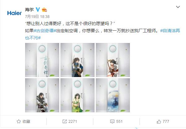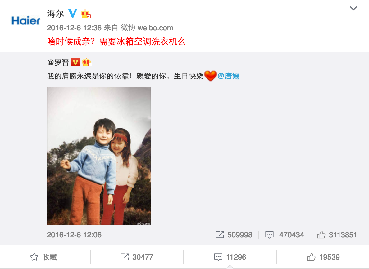 說到海爾,大家的第一印象大多都是搶熱門。比如唐嫣羅晉公布戀情時,海爾官微借勢發(fā)布微博"啥時候成親?需要冰箱空調(diào)洗衣機么"成功帶領了一眾藍V搞事情,因為這個句式很容易被模仿,所以藍V的參與度非常高。