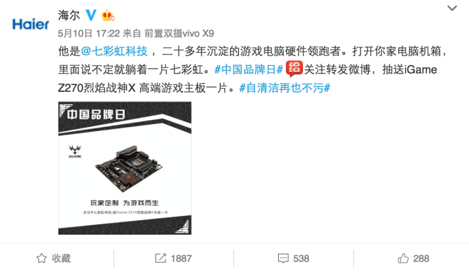 海爾對于幫其他品牌打廣告這件事態(tài)度也很開放。國家品牌日當別人家都在為自己打廣告的時候,海爾官微開放廣告位,為其他企業(yè)打廣告。